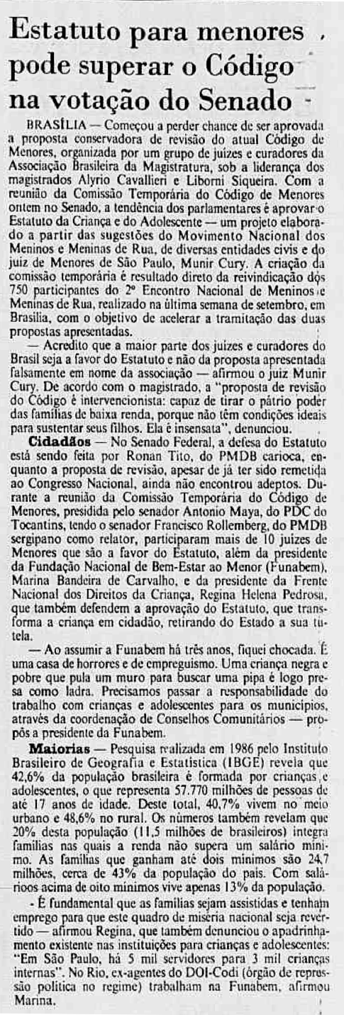 Depois da Constituinte, a intensa mobilização da sociedade civil manteve-se ativa e capilarizada em diversos estados e cidades do país, debatendo a necessidade da superação do Código de Menores de 1979, e, assim, a sociedade civil apresentou a alguns parlamentares propostas de iniciativas legislativas que, posteriormente, tornaram-se proposições legislativas. Estas proposições podem ser divididas em dois blocos: aquelas que visavam alterações pontuais ou a aprovação de uma nova versão do Código; e aquelas que propunham a construção de uma nova lei a partir da doutrina da proteção integral.